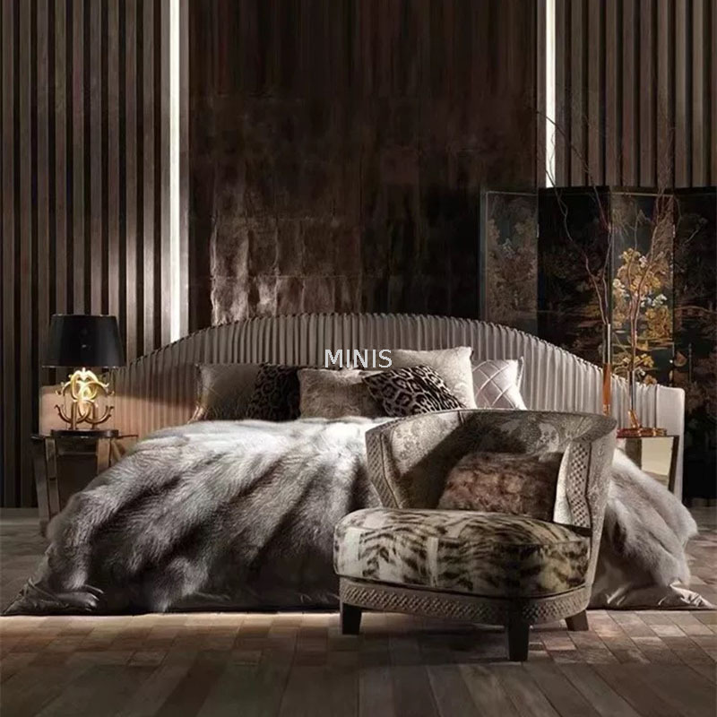 Le pieghe sovrapposte sulla parte principale della testiera del letto hanno un'onda francese e una sensazione delicata. Lo schienale del letto con ampio schermo rende grandioso l'intero spazio, con comodi materassi e copripiumini, rendendo le persone incapaci di resistere alla voglia di sdraiarsi e riposare bene, godendosi la vita aristocratica e meravigliandosi di quanto sia bella la vita.